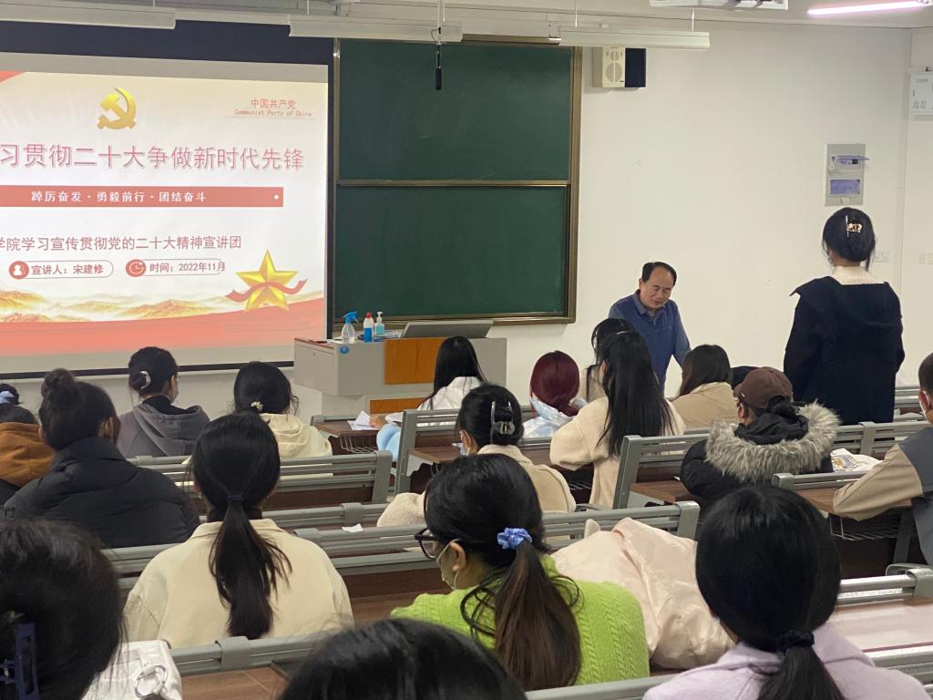 11月20日下午,beat365官方网站党的二十大精神宣讲会在新城校区增信楼3418室举行,院党总支书记宋建修为党员干部和学生代表讲“第一课”。