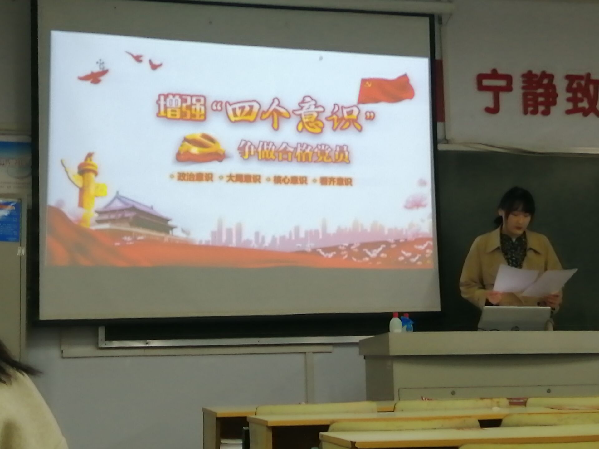 刘鑫婷同志首先通过播放视频简要介绍了“四个意识”和“两个维护”的科学内涵,引入本次党课培训的主题,并通过播放新闻联播片段介绍了不同地方基层组织对党的“四个意识”的看法和落实情况,加深了同学们的理解。接着,刘鑫婷同志从充分认识“四个意识”的必要性和重要意义、深刻理解“四个意识”的科学内涵、强化实践做合格党员三部分,层层分析,深入浅出地讲解了“四个意识”。随后,同学们就孙灿同志提出的“入党积极分子如何强化四个意识”的问题分组展开讨论,并派出代表分享了各组自己的看法,进行思想交流。