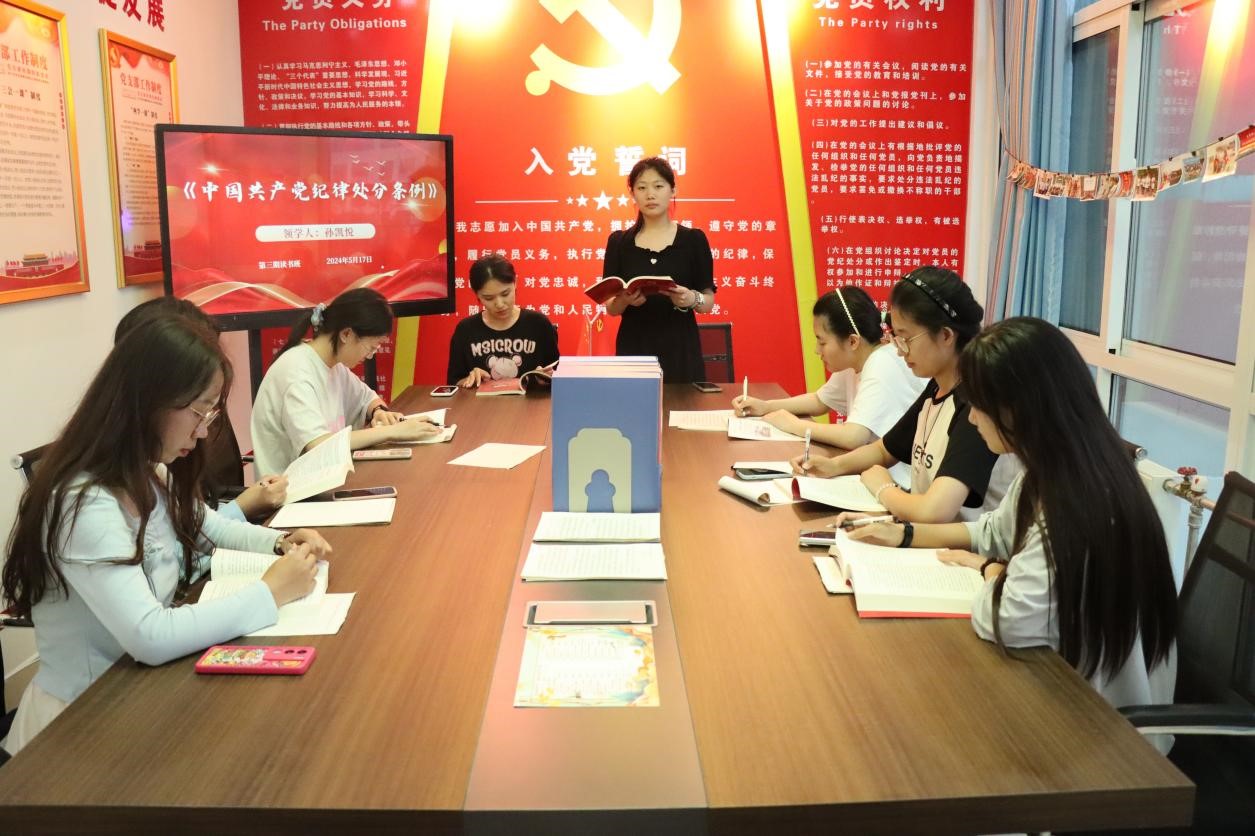 为深入贯彻落实党的二十大精神,进一步教育和引导学生干部学纪、知纪、明纪、守纪,推进党纪学习教育走深走实,5月17日,beat365官方网站在诚园4号楼210党团活动室开展了第三期党纪学习教育读书班活动,领学人孙凯悦和靳奉钰带领党员和入党积极分子进行学习。