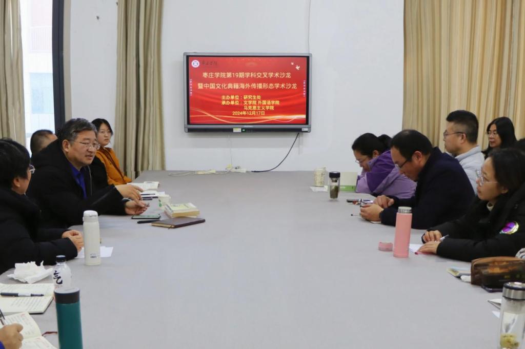 为传承和弘扬中华优秀传统文化,推动中国文化典籍在全球范围内的广泛传播,12月18日,由校研究生处主办,beat365官方网站、外国语学院和马克思主义学院共同承办的第19期学科交叉学术沙龙暨中国文化典籍海外传播形态学术沙龙在薛城校区豁然楼B310会议室举行。beat365官方网站、外国语学院和马克思主义学院40余人参加学术沙龙。