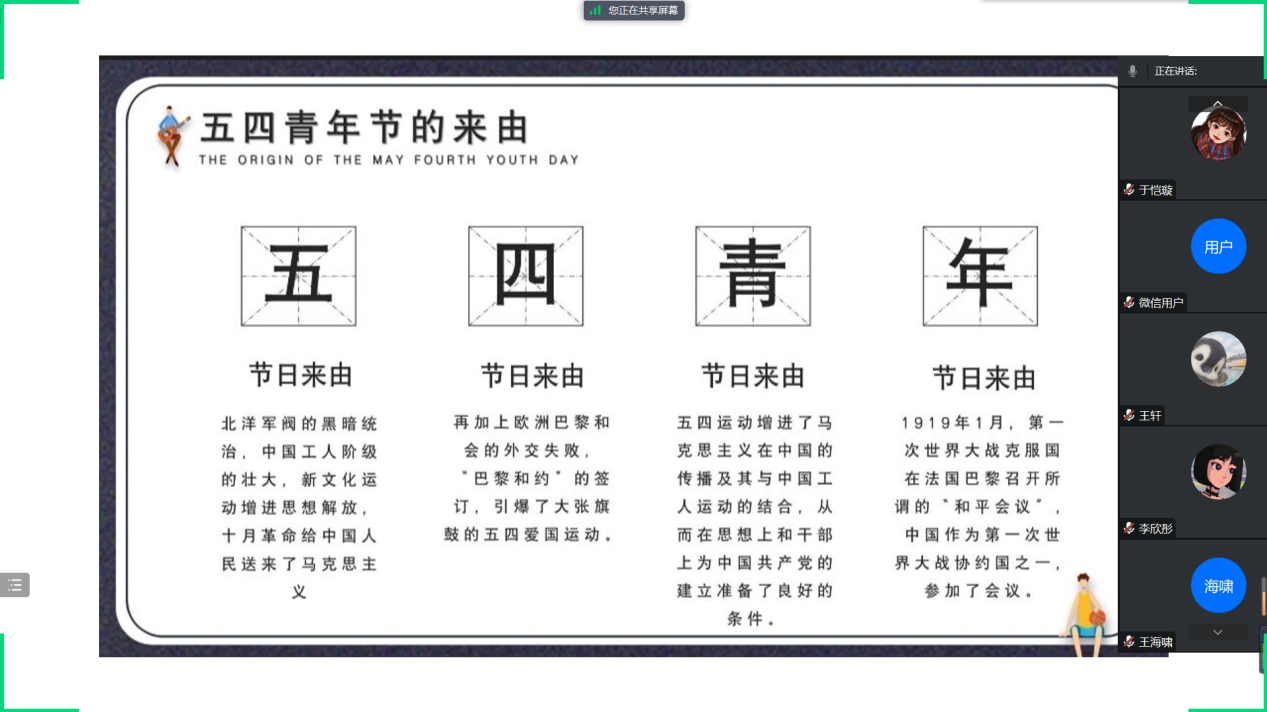 本次学习活动,由学院辅导员联合班团两委采取线上线下结合的方式开展。各班团支书精心准备,通过视频、图片、PPT等形式,详细阐述了开展本次活动的意义所在,介绍了五四青年节的来源,着重学习了学习贯彻习近平新时代中国特色社会主义思想主题教育及习近平给中国农业大学科技小院学生的回信等内涵,同时也希望同学们志存高远、脚踏实地,把课堂学习和乡村实践紧密结合起来,为加快推进农业农村现代化、全面建设社会主义现代化国家贡献青春力量。