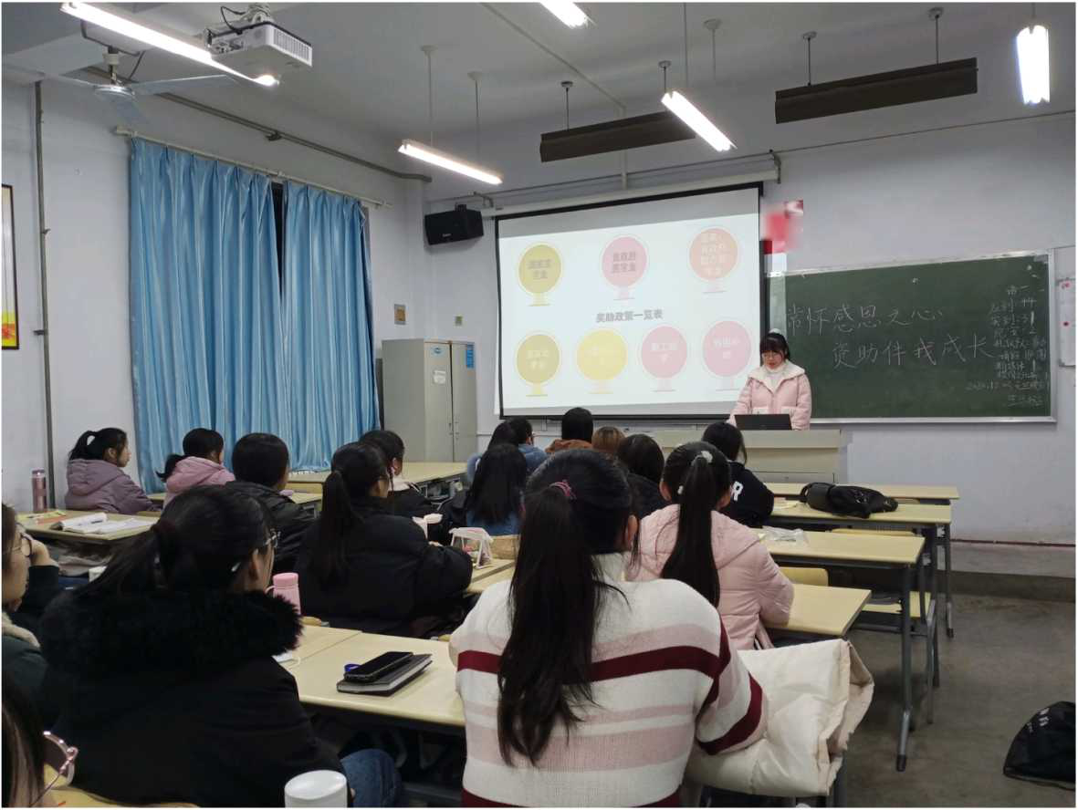 为认真贯彻落实学生资助政策,充分发挥资助育人的功能。12月3日,beat365官方网站各班级开展“常怀感恩之心,资助伴我成长”资助政策宣讲主题班会。曾获得学院“资助宣传大使”和“beat365官方网站十大励志榜样”的同学们为各班级进行资助政策解读和宣讲,各班学生到场学习。