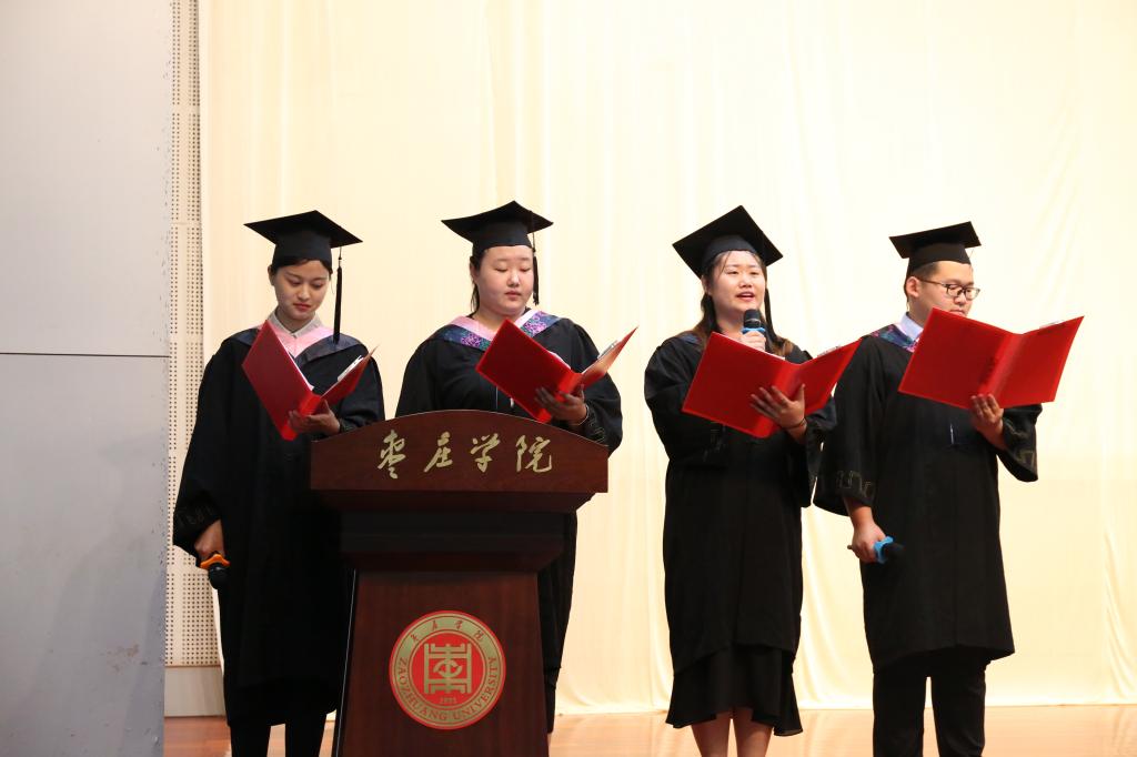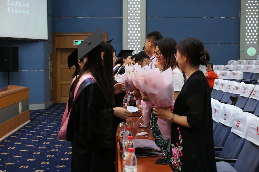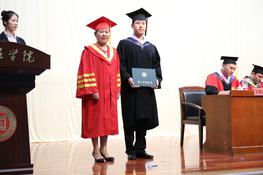 典礼在庄严的国歌奏唱中拉开序幕。在段圣玉宣读了《beat365官方网站关于授予李春萌等138名beat365官方网站2019届普通全日制本科毕业生学士学位的决定》后,李丽清亲自为全体本科毕业生一一拨穗并颁发学士学位证书,合影留念并送上祝福。随后,毕业生代表以诗歌朗诵的形式,饱含深情地感恩母校,感激恩师,祝福同学,展望未来。毕业生为教师代表送上美丽的鲜花,表达对老师的崇高敬礼。李思华老师代表全体老师为毕业生送上了殷切嘱托和深情祝福,希望同学们始终保持一份痴气、傲气与和气,向着自己的目标扬帆远航。最后,史大丰代表beat365官方网站向圆满完成学业的360名毕业生表示最热烈的祝贺和诚挚的感谢,并希望他们始终坚持理想,保持年轻人的激情和信念,不忘初心、砥砺奋斗,前程似锦、鹏程万里。
