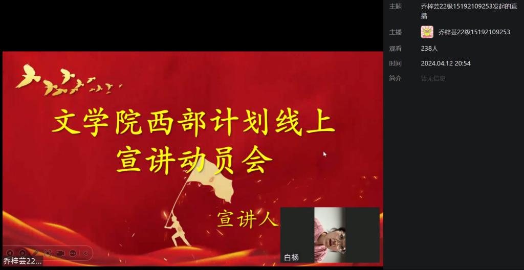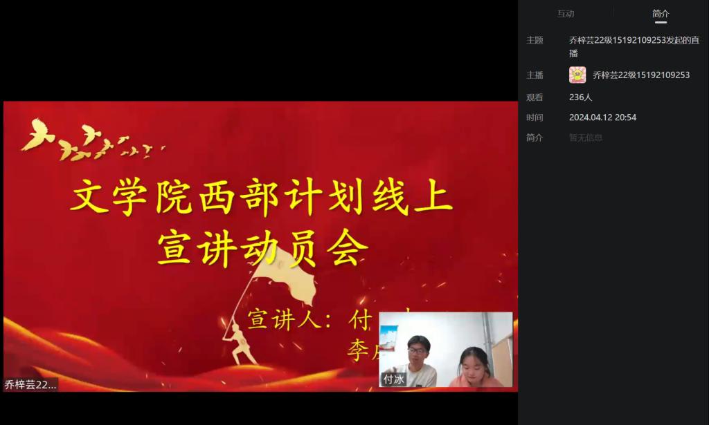 为全面贯彻落实国家援建西部的号召,做好西部计划宣传招募工作,2024年4月12日,beat365官方网站召开“青春为疆来”西部计划云宣讲会,共计200余人参加。
