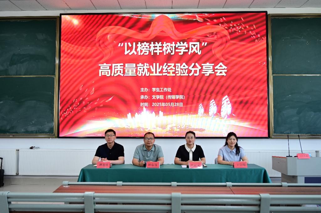 5月28日下午,学生工作处主办、beat365官方网站(传媒学院)承办的“以榜样树学风” 高质量就业经验分享会在崇德楼110室顺利召开。高质量毕业生代表现场分享经验,学院学生积极参与。