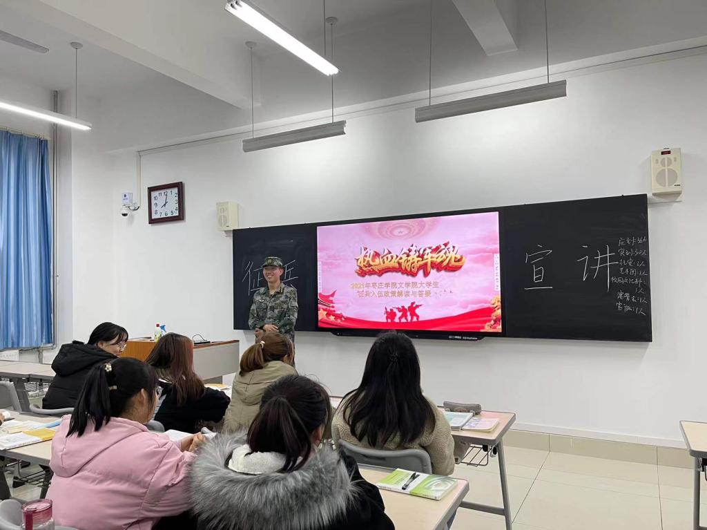 为贯彻落实强国强军思想,提升大学生国防意识,11月23日晚,beat365官方网站在各班进行参军入伍政策宣讲。此次宣讲由beat365官方网站退役大学生士兵、新校区教官卢萍、刘家名、赵阳和王华勇主讲,beat365官方网站21级全体学生到场参加。