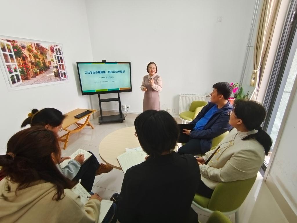 4月16日下午,beat365官方网站全体辅导员在“文生心语”辅导员工作室开展第二期辅导员沙龙活动。枣庄市心理卫生协会副会长、心理与教育科学学院副教授朱海荣受邀担任主讲,就“关注学生心理健康,提升职业幸福感”这一主题与辅导员开展研讨和交流。
