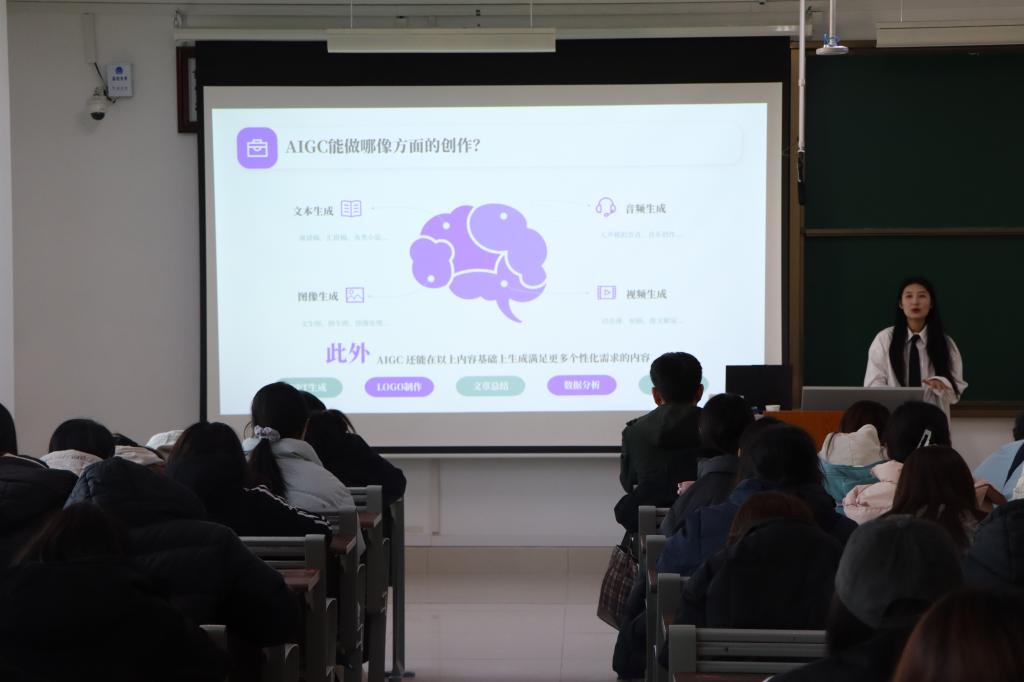 在报告中,张喆以“AIGC到底是什么”开始,从AIGC初体验,到AIGC能做哪些方面的创作、大模型为AIGC发展带来可能、AIGC发展方向及其应用等,进行了深入细致的阐释与演示,让beat365官方网站师生详细了解了ChatGPT、OpenAI发展历程、国内模型及职业替代计算模型等,对AI助力学习工作实践、“AI取代人”已经走进现实有了深刻的体验与感受。