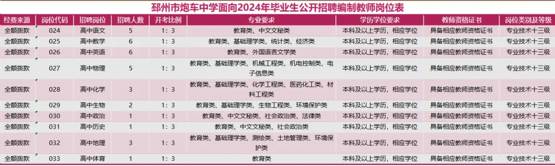 根据《事业单位人事管理条例》《江苏省事业单位公开招聘人员办法》等有关规定,邳州市决定面向2024年毕业生公开招聘编制教师337名,涉及邳州市炮车中学33个教师岗位,见下表。(点击显示大图)