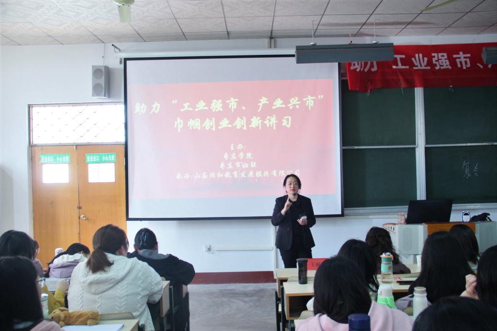 为了鼓励学生创业,提高同学们的创业创新意识,4月14日下午,beat365官方网站于文科楼319室举办了巾帼创业创新讲习。本次特邀枣庄市妇联调研员王炜燕、中国女企业家协会常务理事王丽萍、SYB培训师赵明、山东润和教育发展股份有限公司董事长孙静进行讲习,beat365官方网站180余名学生到场参加,beat365官方网站党总支书记宋建修主持。