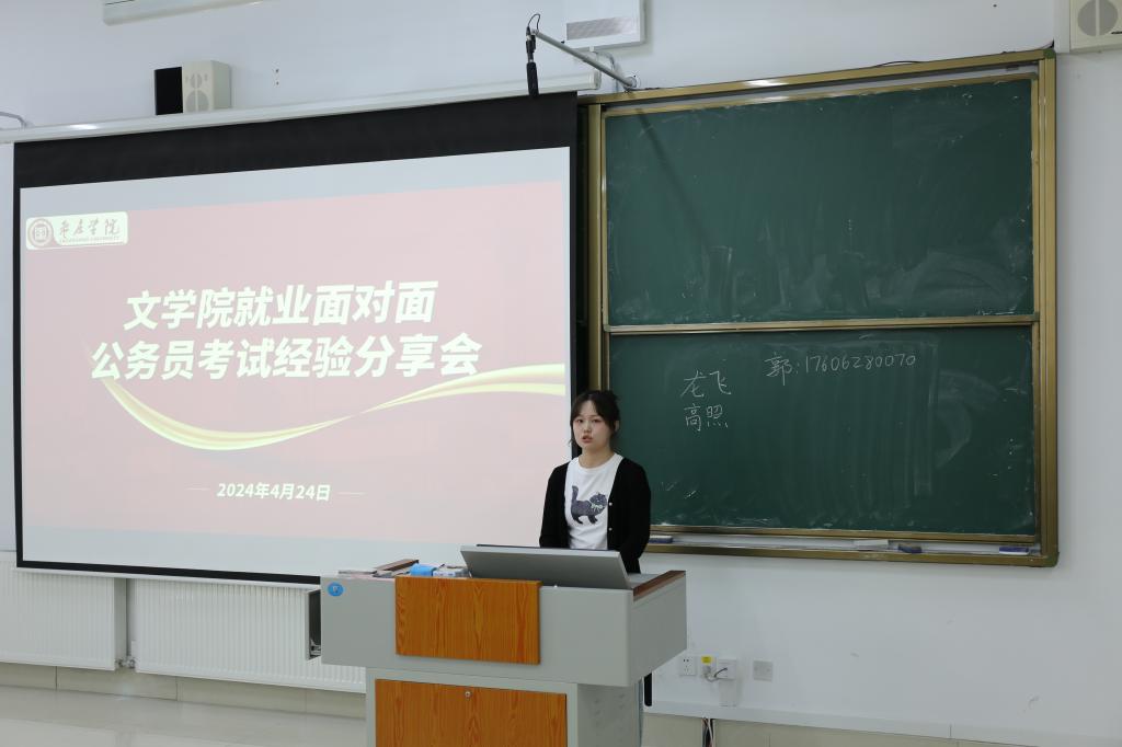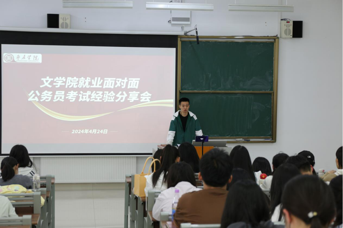 郭润泽结合自身公务员考试的成功经验,从考试内容、学习资料选择、面试准备、考试技巧等方面展开分享。刘姝妍重点分析适合同学们报考的岗位,建议同学们及时关注时政热点,多读评论员文章,以提高自己的申论写作能力。李俊彦则针对行测和申论中各个模块的复习方法和答题技巧给出建议,强调认真备考的重要性,激励大家踏踏实实地完成自己制定的备考计划。王华勇分析了文学类专业在公务员考试中的优点和弱势,鼓励同学们要坚定信念、扎实准备,学好专业知识,增强个人竞争力,努力应对各种挑战。
